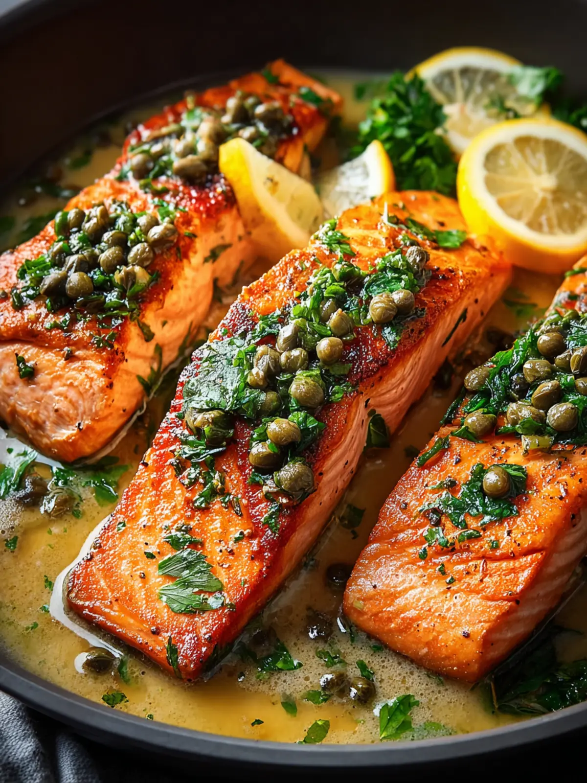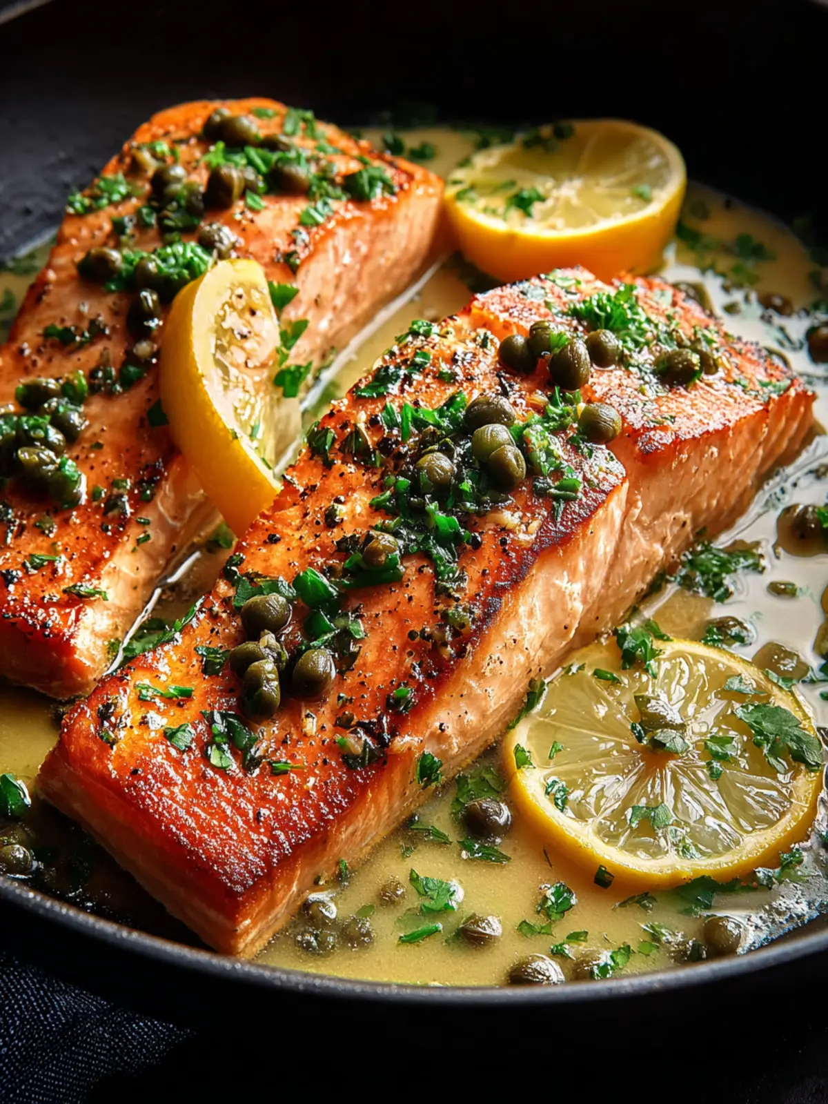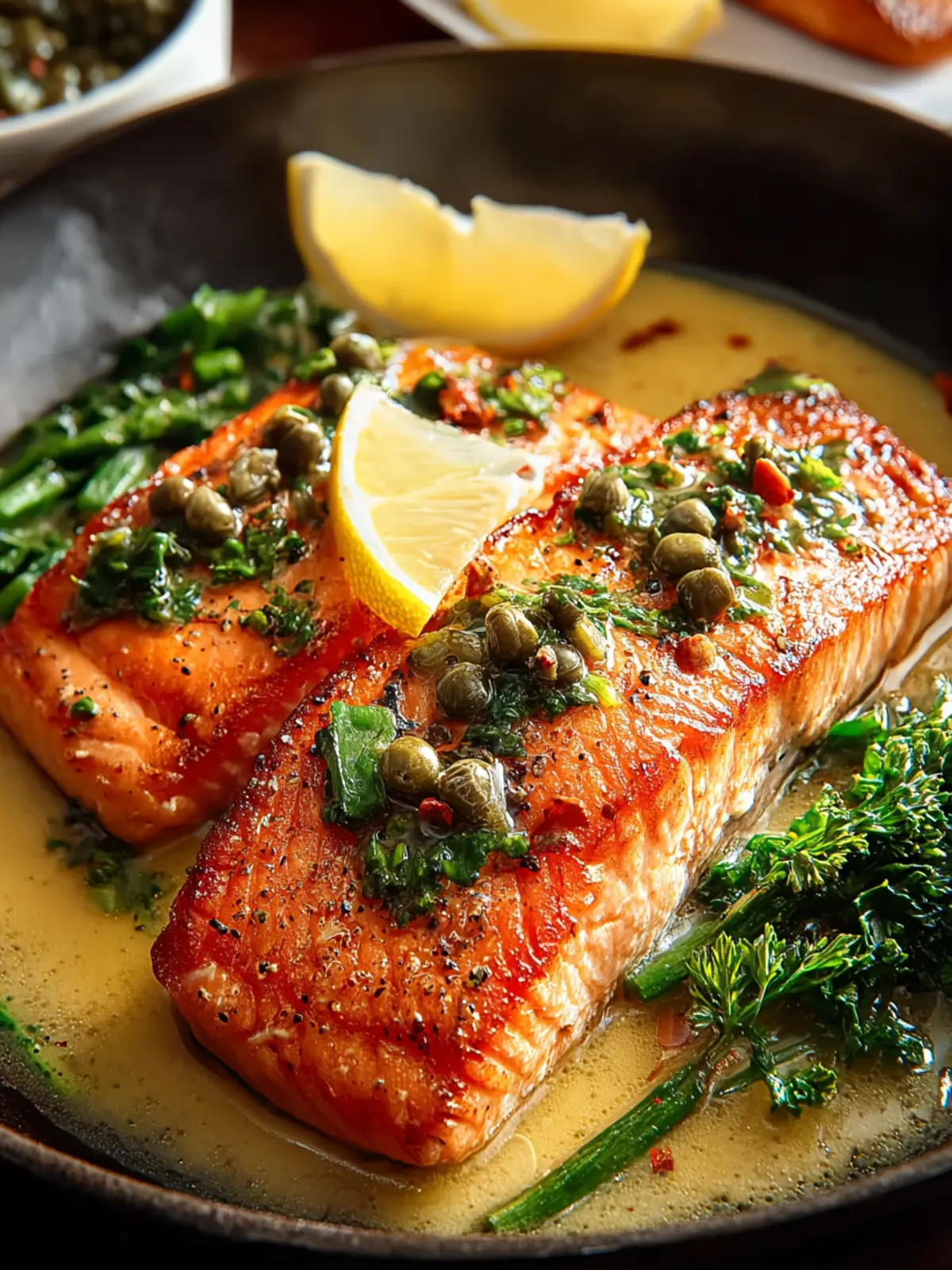 This delicious pan-seared salmon is complemented by a zesty lemon and caper sauce, perfect for serving over pasta or alongside vegetables.
