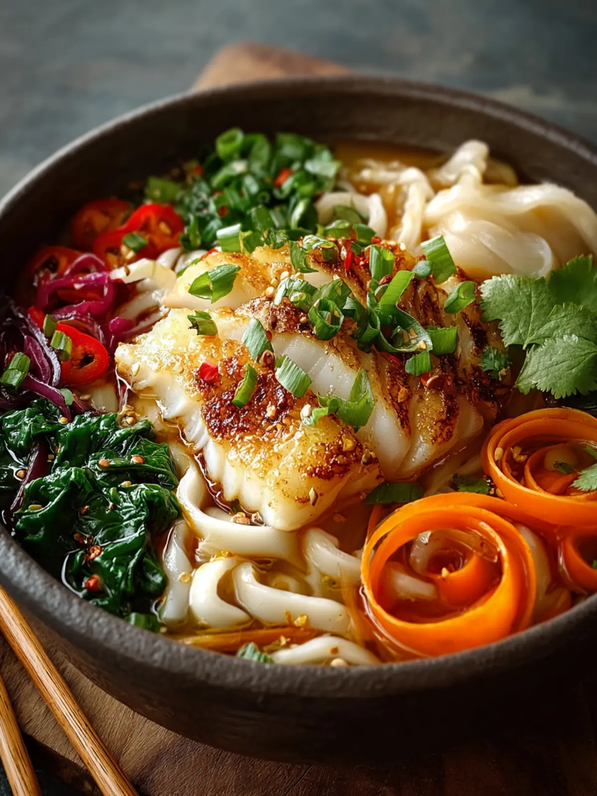 - Top each noodle bowl with a poached cod fillet. Garnish with sliced spring onions and fresh coriander leaves. Serve immediately.