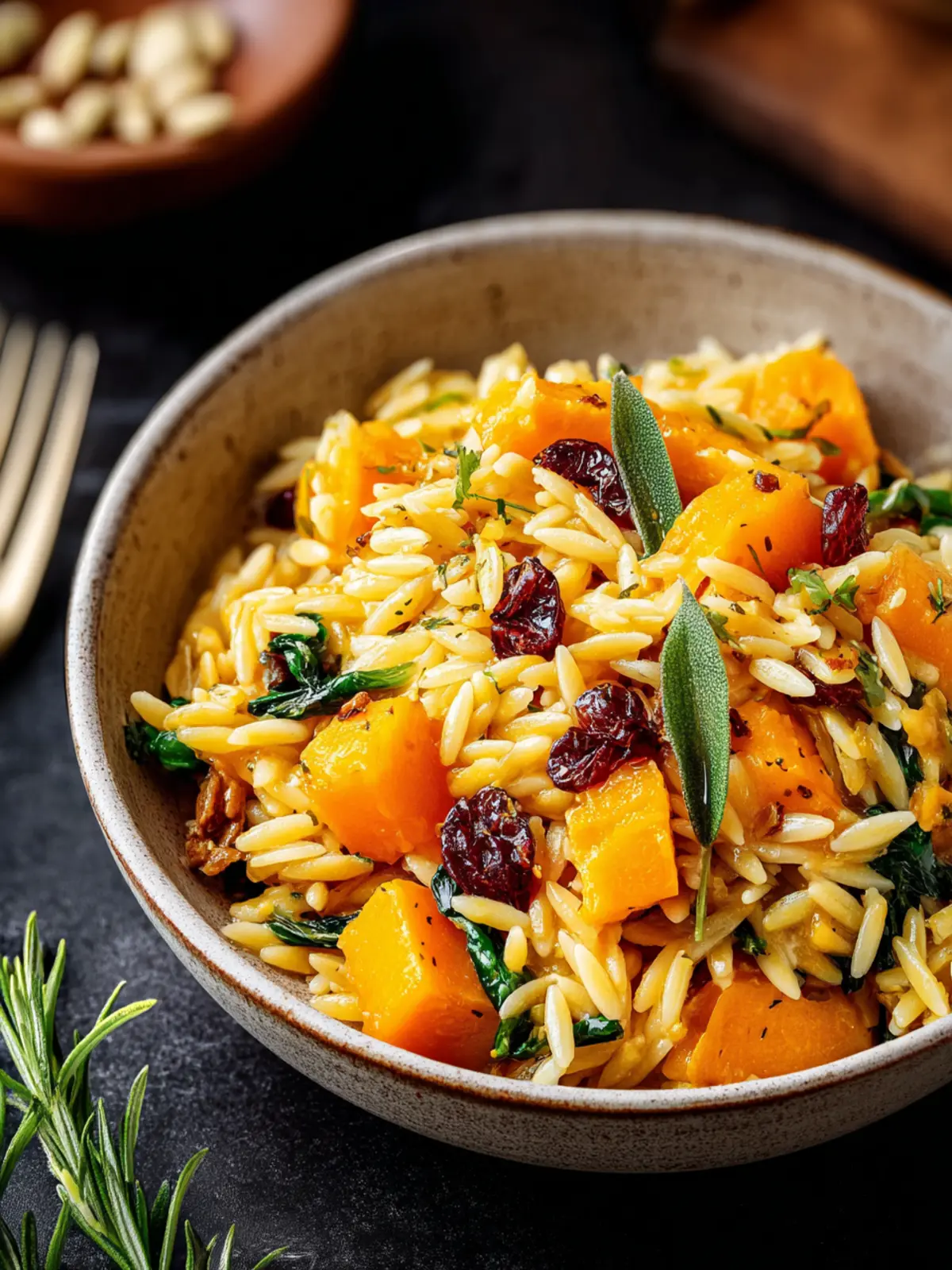 Spinach: Fresh spinach adds a pop of color and a nutritional boost. It wilts perfectly into the warm orzo, providing both health benefits and a lovely contrast to the sweetness of the squash.