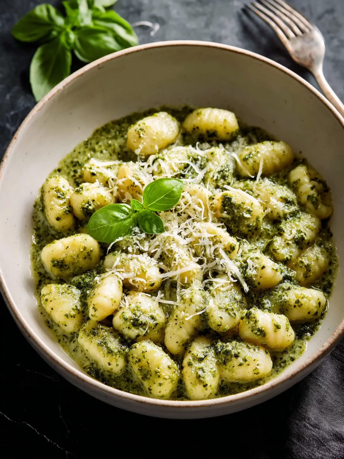 A delicious creamy pesto gnocchi dish made with fresh basil and Parmesan cheese.