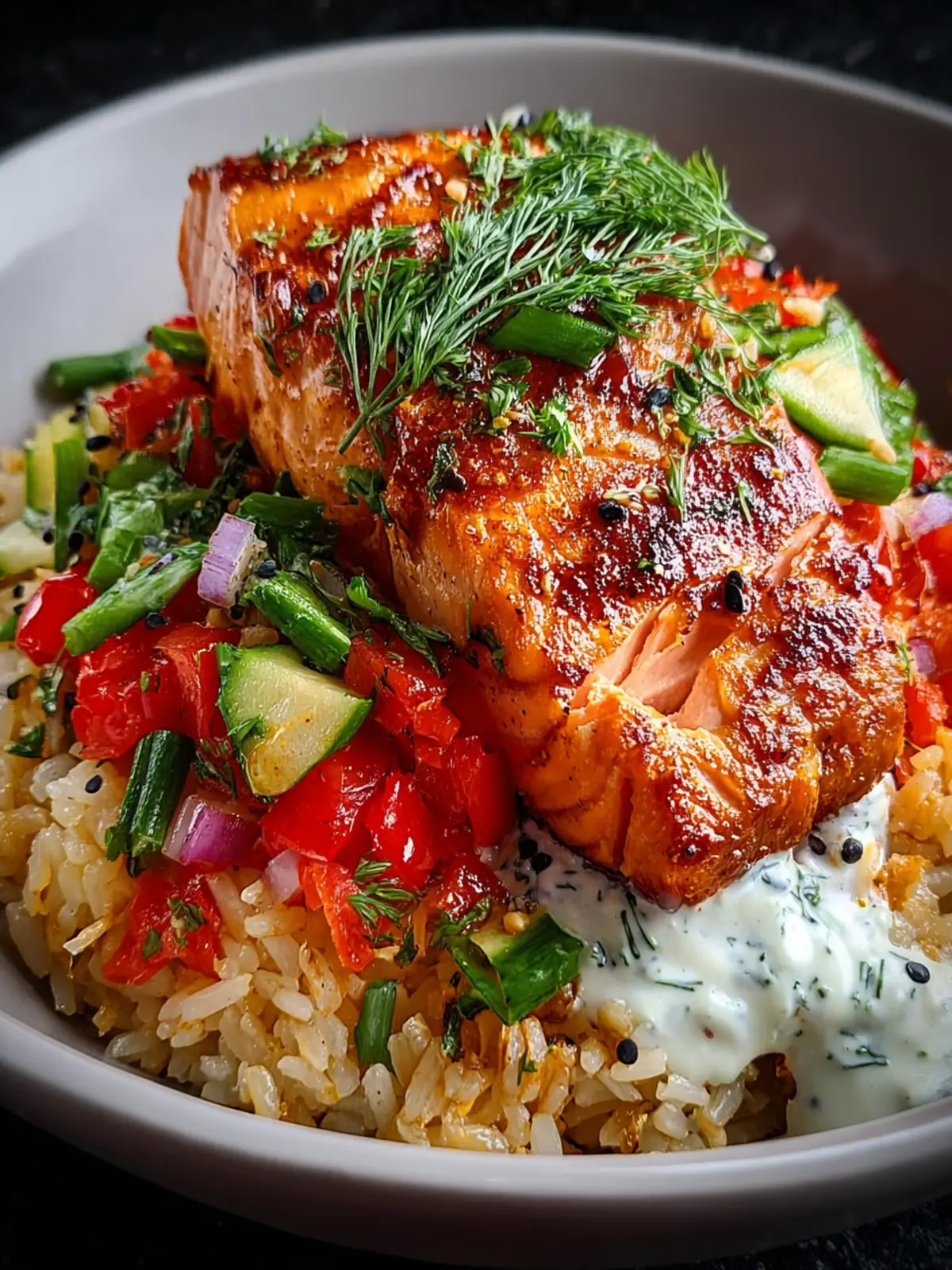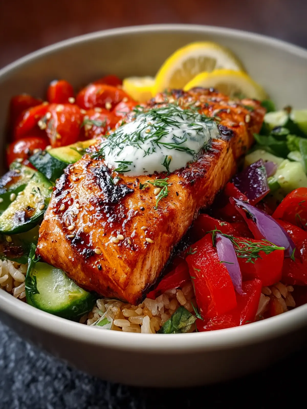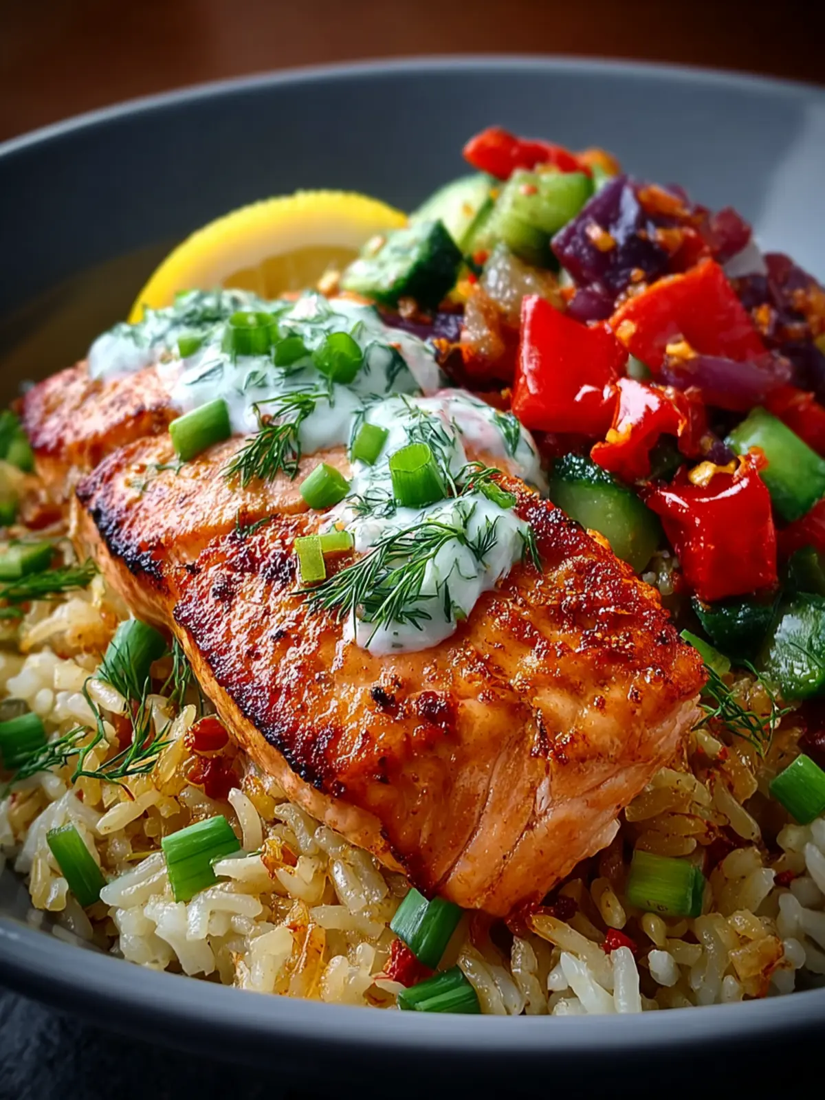 - Assemble the Bowls: Top crispy rice with sautéed vegetables. Place a salmon fillet on each bowl. Drizzle with lemon-yogurt sauce, garnish with fresh herbs, and serve with lemon wedges.