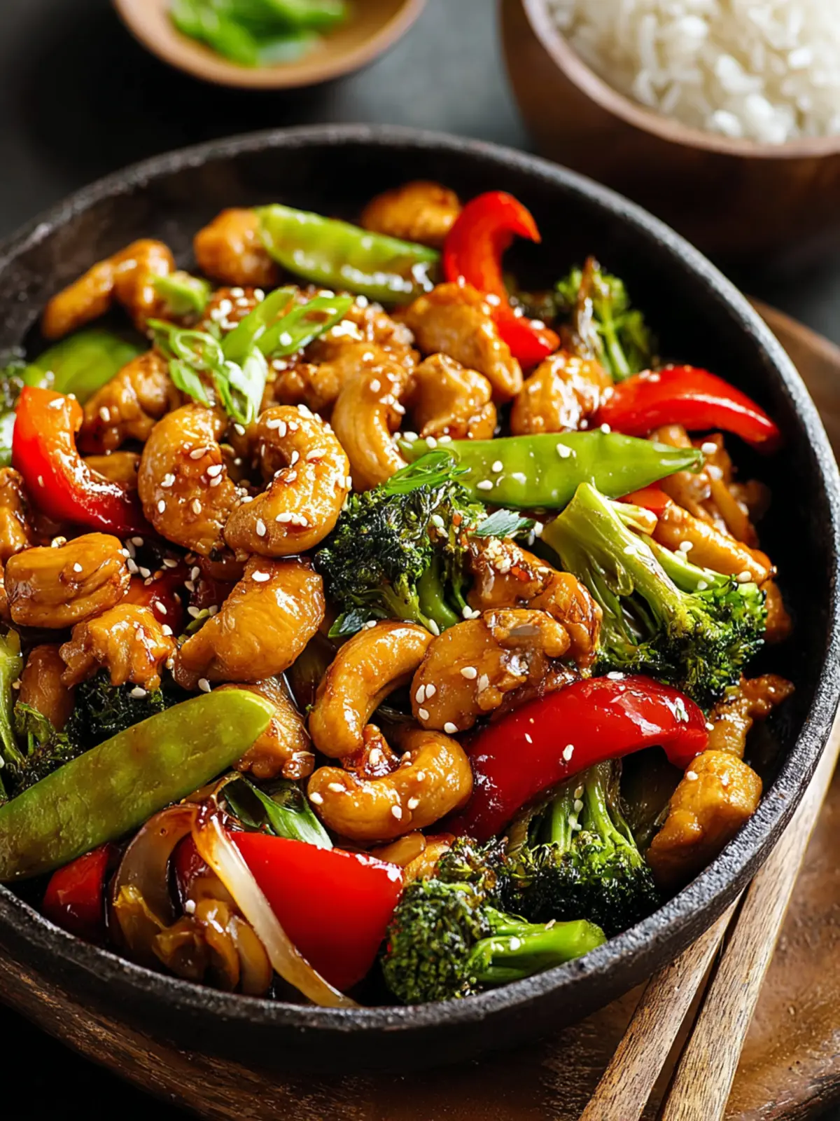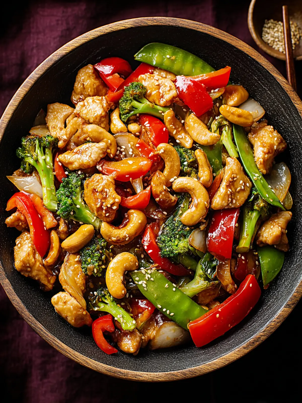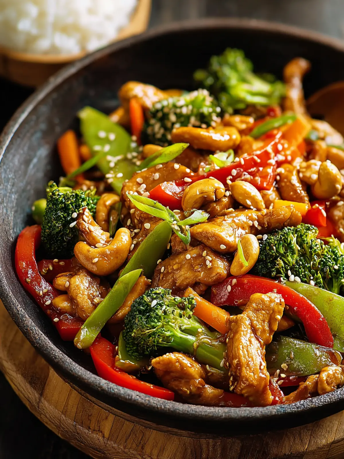 A delicious stir-fry featuring tender chicken, vibrant vegetables, and crunchy cashews, all coated in a flavorful sauce.