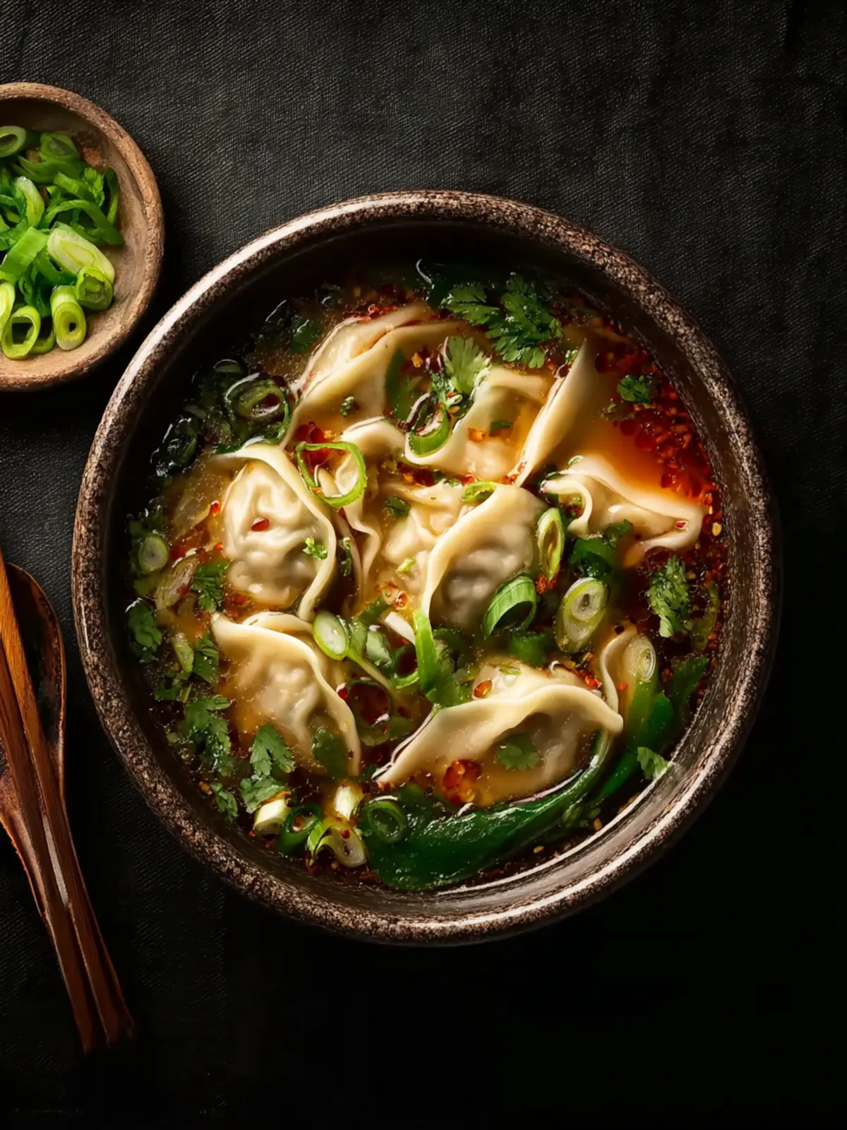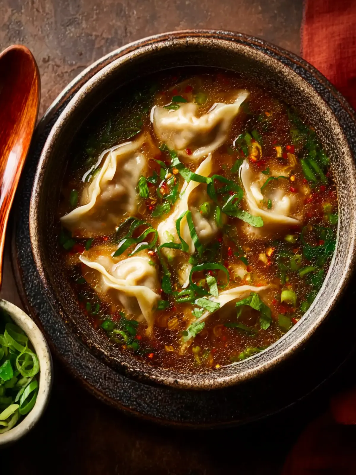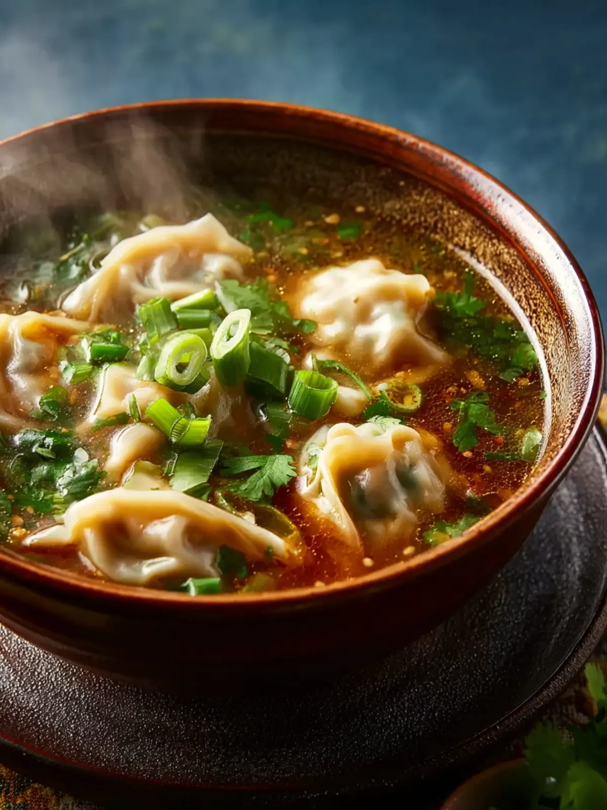 A comforting and flavorful soup featuring potstickers, fresh vegetables, and aromatic broth.